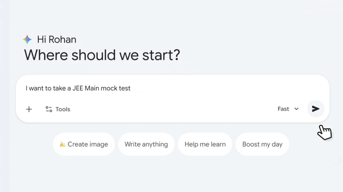 Gemini पर JEE मॉक टेस्ट इस्तेमाल करना काफी आसान रखा गया है। स्टूडेंट को बस एक सिंपल प्रॉम्प्ट डालना होगा, जैसे “I want to take JEE test” और इसके बाद AI मॉक टेस्ट जनरेट कर देगा। बताया जा रहा है कि इन सवालों का डिफिकल्टी लेवल असली JEE एग्जाम के काफी करीब होगा, ताकि छात्रों को रियल एग्जाम का अनुभव मिल सके।