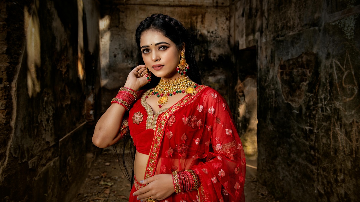 Prompt: Convert the uploaded photo into a regal Indian traditional portrait. Emphasize rich textures like silk saree drapes (deep reds, maroon, or gold), intricate gold temple jewelry, and a touch of intense mehndi patterns on hands. The lighting should be soft, warm, and slightly dramatic, reminiscent of a cinematic Indian drama. The background should suggest a soft, blurred traditional setting, possibly with subtle mandap elements or a moonlit terrace. --style traditional Indian art --vibrant --detailed
