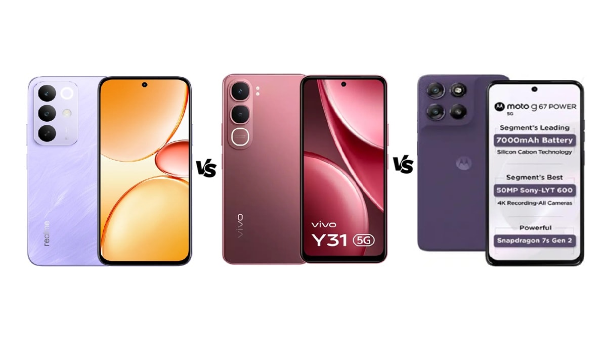 Realme ने हाल ही में भारत में नया स्मार्टफोन Realme C85 5G लॉन्च कर दिया है, जिसकी टक्कर Moto G67 Power 5G और Vivo Y31 5G से हो रही है। Realme C85 5G में मीडियाटेक डाइमेंसिटी 6300 प्रोसेसर मिलता है। जबकि Moto G67 Power 5G में क्वालकॉम स्नैपड्रैगन 7s जेन 2 चिपसेट है। वहीं Vivo Y31 5G ऑक्टा कोर स्नैपड्रैगन 4 जेन 2 प्रोसेसर के साथ आता है। यहां हम आपको Realme C85 5G, Moto G67 Power 5G और Vivo Y31 5G के बीच तुलना करके विस्तार से बता रहे हैं।